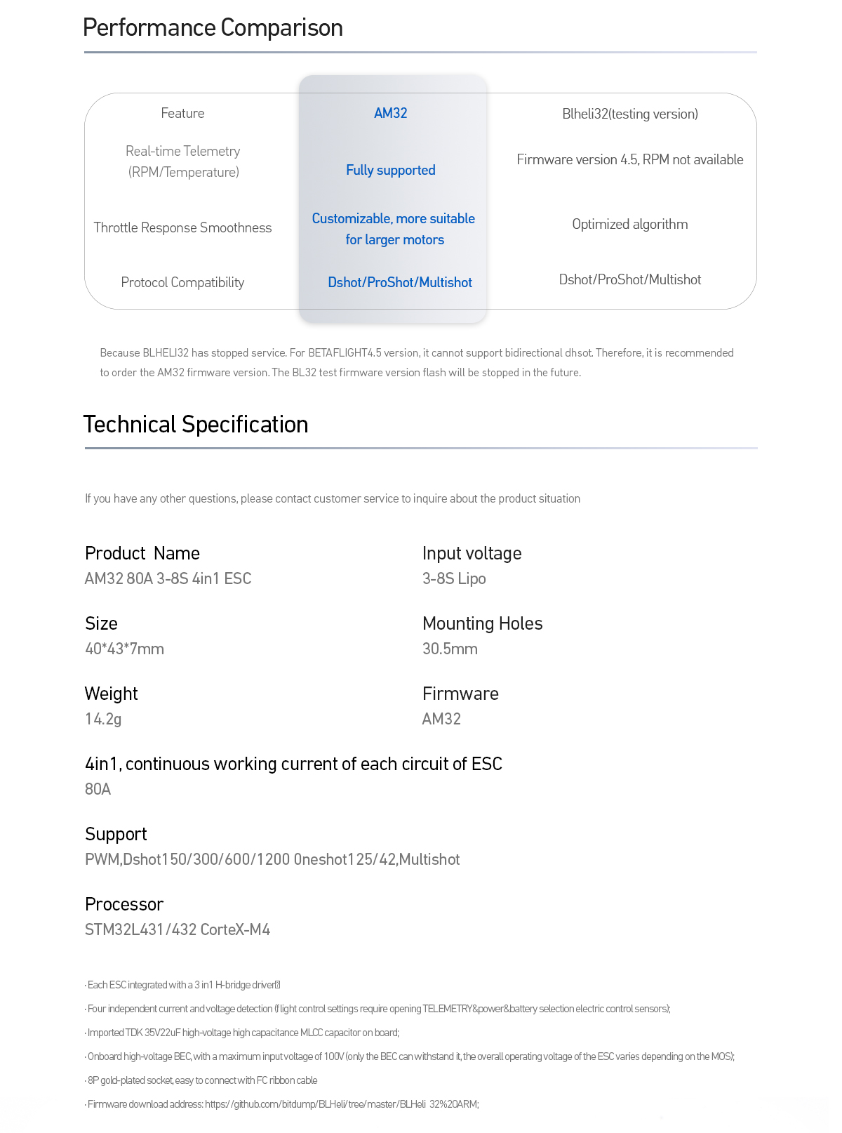 Lipo:3-8SContinue current:80ACurrent sensor:SupportTelemetry feedback: Support