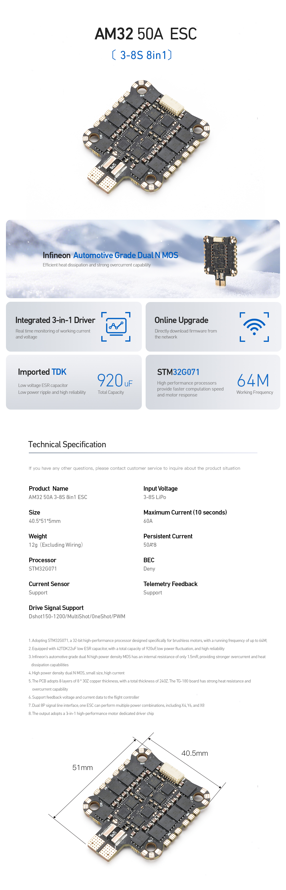 Lipo:2-8SMax Current:60AContinue current:50A*8Current sensor:SupportTelemetry feedback: Support