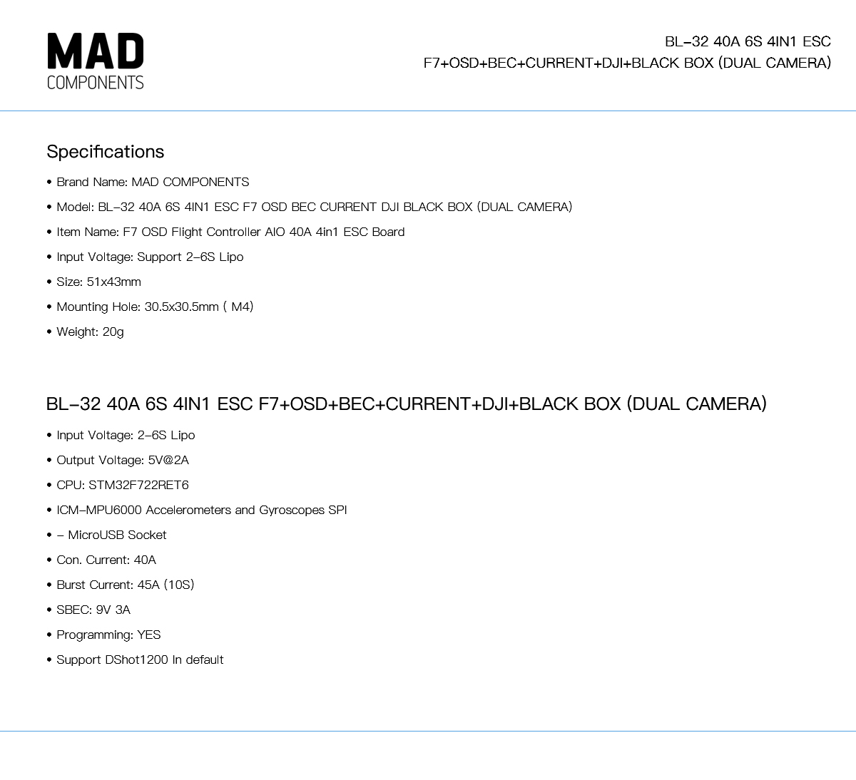 BLHELI IS BETA VERSION,IT CAN'T UPDATED. Because BLHELI32 has stopped service. For BETAFLIGHT4.5 version, it cannot support bidirectional dhsot. It is recommended to order the AM32 firmware version. The BL32 test firmware version flash will be stopped in the future. Model: BL-32 40A 6S 4IN1 ESC F7 OSD BEC CURRENT DJI BLACK BOX (DUAL CAMERA). Item Name: F7 OSD Flight Controller AIO 40A 4in1 ESC Board. Input Voltage: Support 2-6S Lipo. Size: 51x43mm. Mounting Hole: 30.5x30.5mm ( M4). Weight: 20g. This ESC is only recommended to use a motor with 4, 5inch propeller, and the motor is 2306/2207.5/2207.