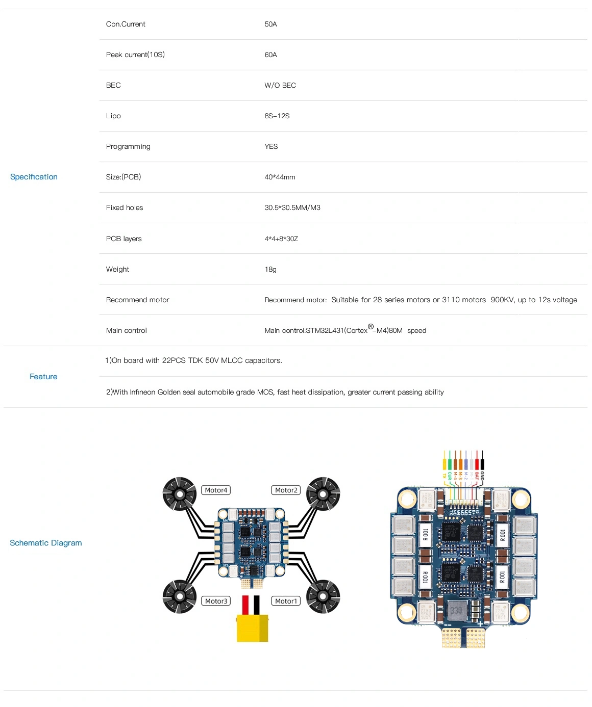 BLHELI IS BETA VERSION,IT CAN'T UPDATED. Because BLHELI32 has stopped service. For BETAFLIGHT4.5 version, it cannot support bidirectional dhsot. It is recommended to order the AM32 firmware version. The BL32 test firmware version flash will be stopped in the future. Model:BLHeli-32 50A, Input Voltage: Support 8-12S Lipo, With 25pcs TDK high voltage 50V MLCC capacitors. Inclulded 1pc 50V 1000uF 1pc 8P connector