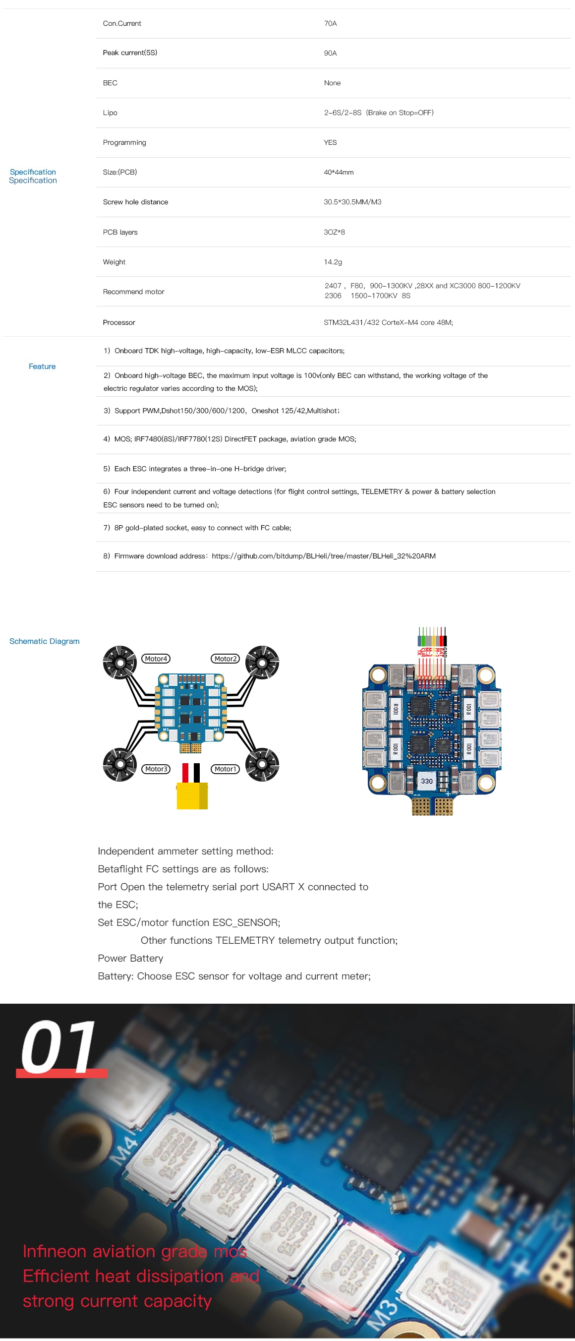 BLHELI IS BETA VERSION,IT CAN'T UPDATED. Because BLHELI32 has stopped service. For BETAFLIGHT4.5 version, it cannot support bidirectional dhsot.It is recommended to order the AM32 firmware version. The BL32 test firmware version flash will be stopped in the future.Model:BLHeli-32 70A, Input Voltage: Support 2-6S/(2-8S) Lipo, Inclulded 1pc 50V 1000uF 1pc 8P connector