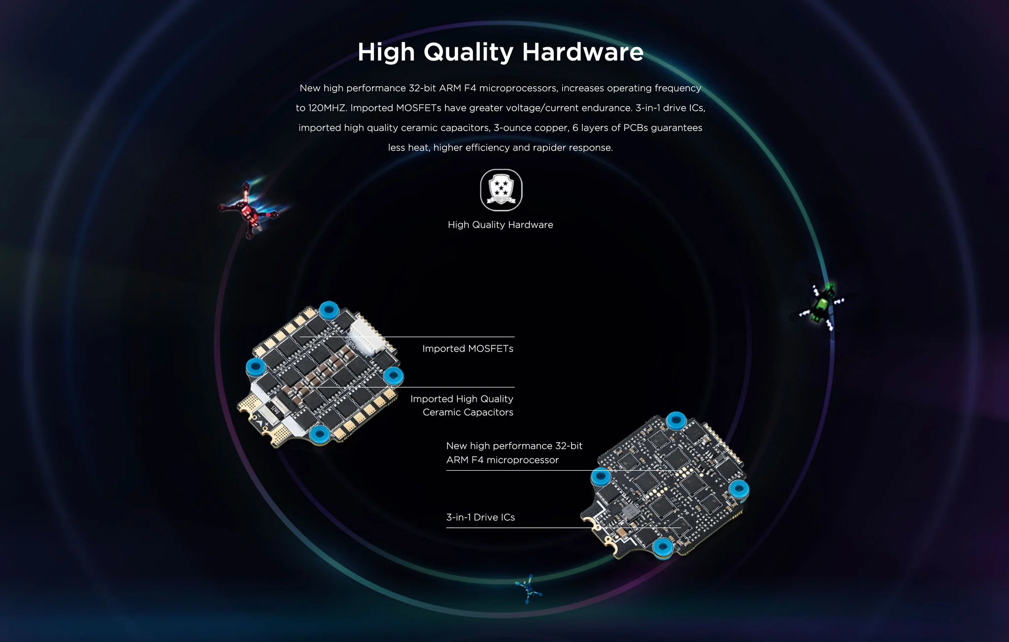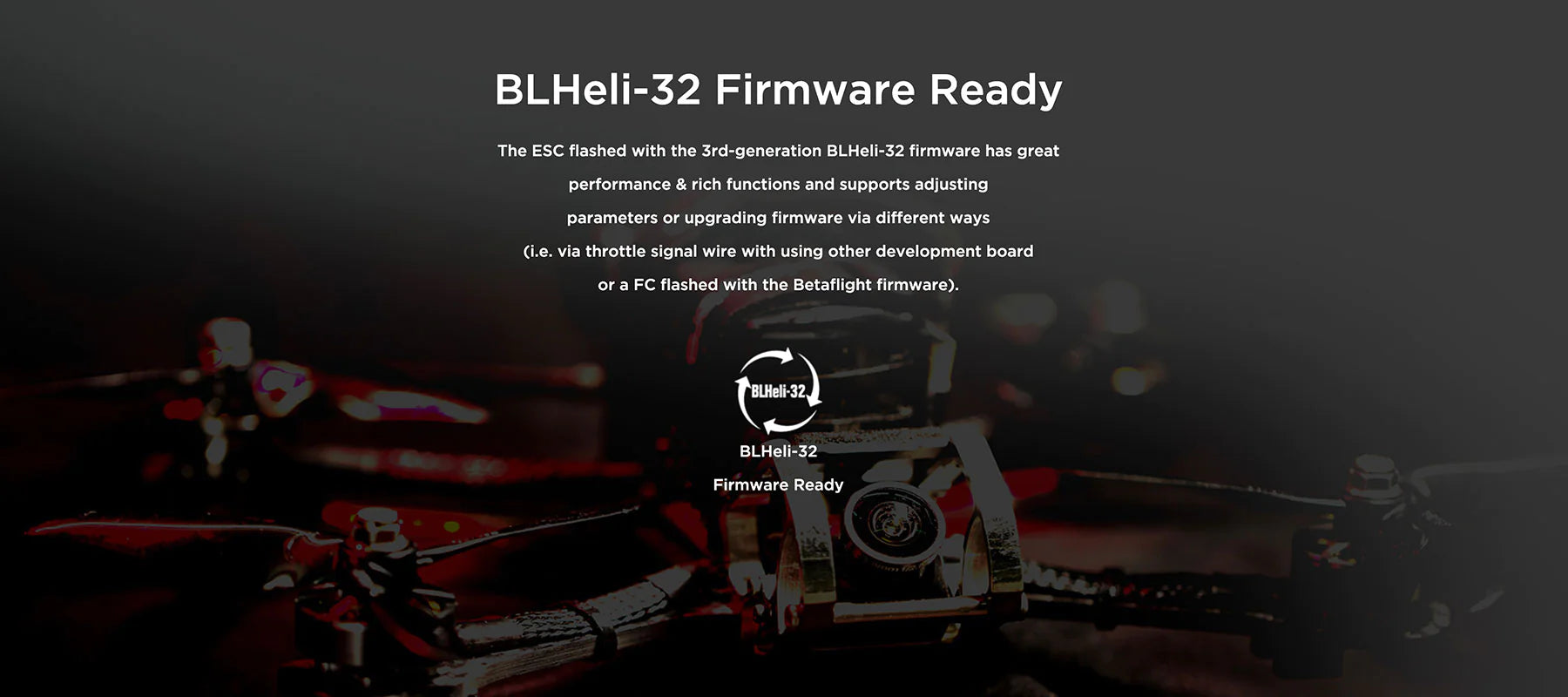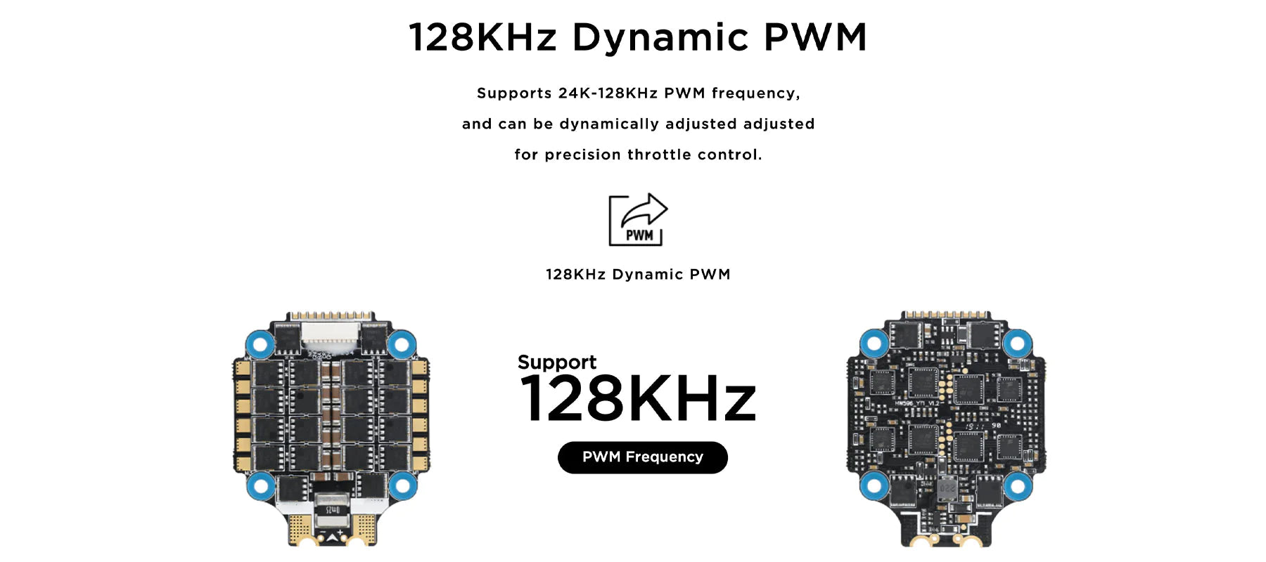 - The third generation BLHeli_32 code can support up to 128KHz PWM output frequency, which can be compatible with more motors.