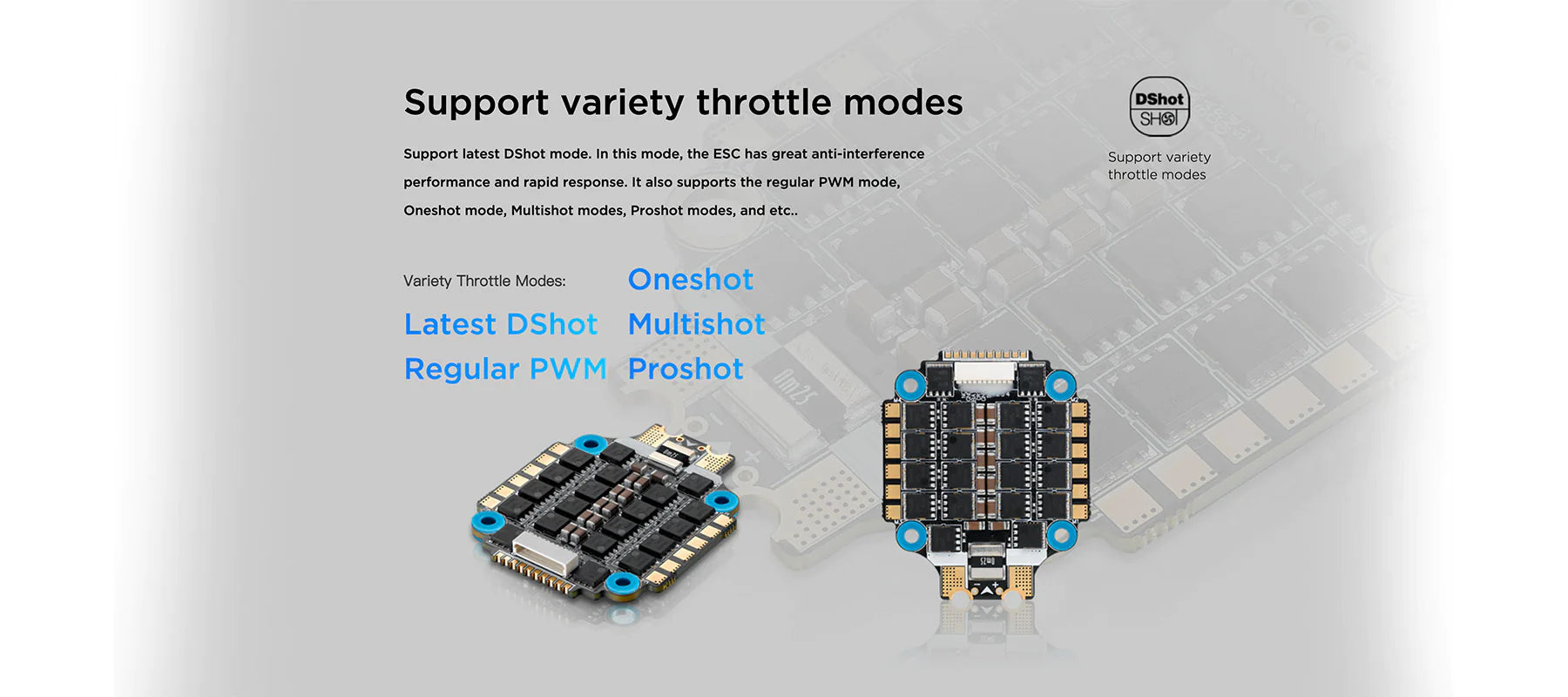 - Dshot signaling is supported at any rate up to at least Dshot1200. The input signal is automatically detected by the ESC upon power-up.